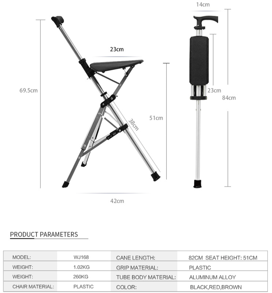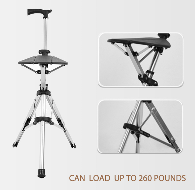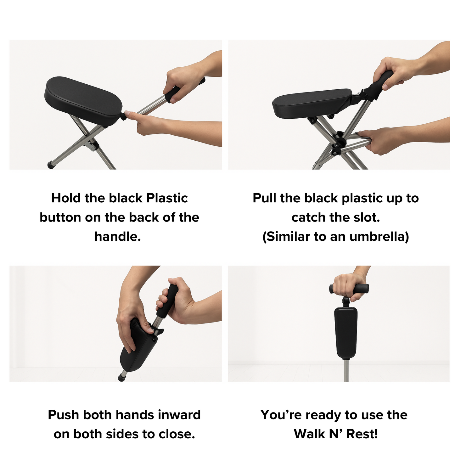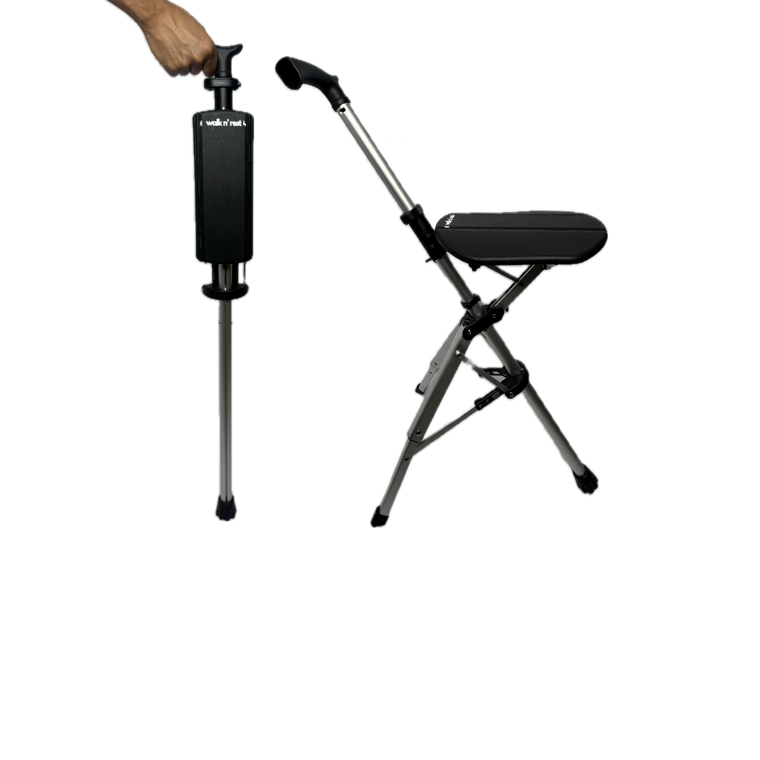 Introducing Walk 'Nā Rest, the ultimate mobility solution: a portable cane with an attached chair, all in one. Featuring a three-piece curved sturdy seat that folds easily, this innovative design ensures comfort and stability wherever you go. With non-slip feet, you can sit confidently without worrying about slipping. Perfect for those who need reliable walking aid and a convenient place to rest.
